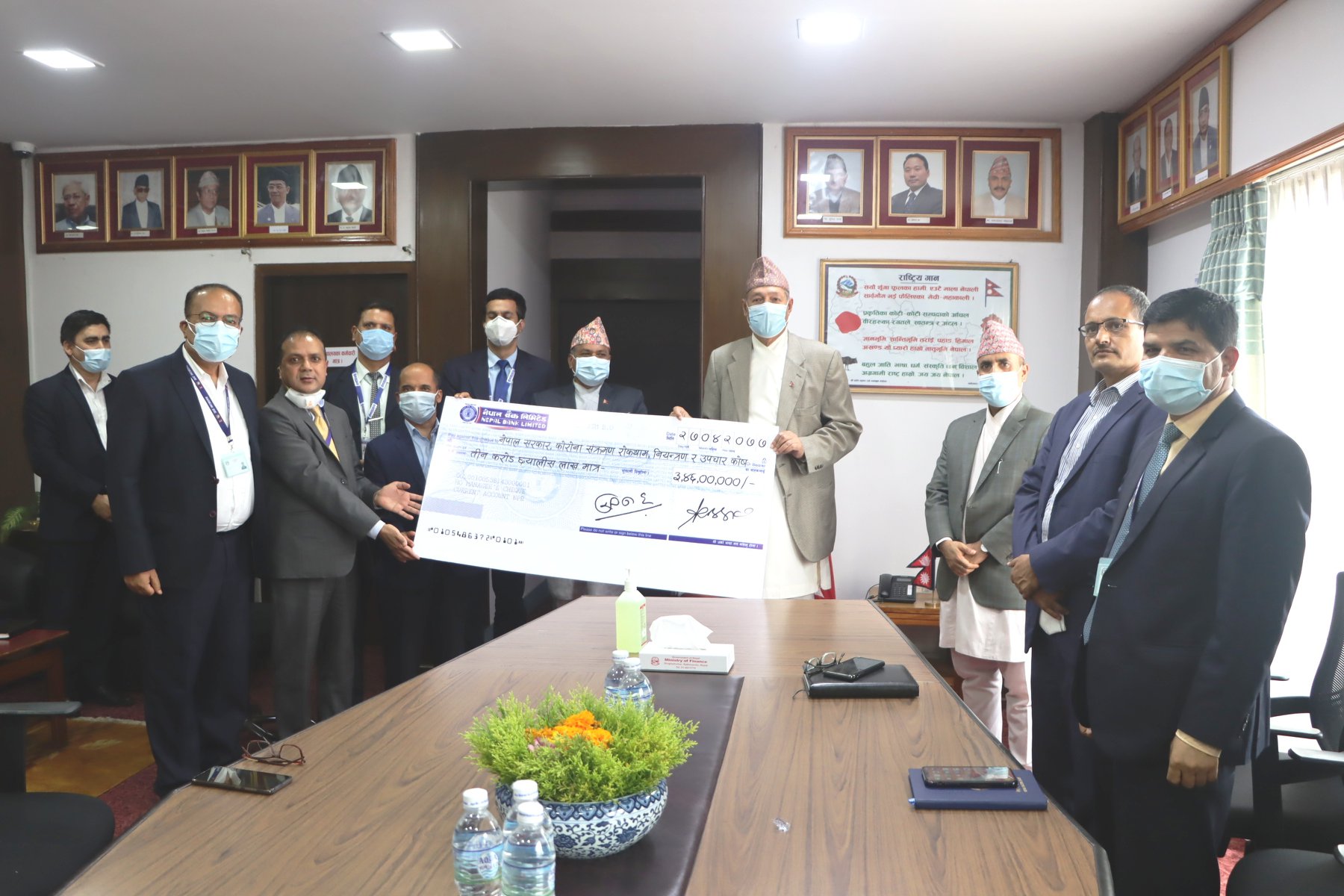 मंगलबार बैंकका प्रतिनिधिले स्वास्थ्य तथा जनसंख्या मन्त्री भानुभक्त ढकाललाई भेटेर चेक हस्तान्तरण गरेका हुन् । बैंकले कोरोना भाइरसले प्रभावित पारिरहेको घडीमा सरकारलाई दिएको बताएको छ ।