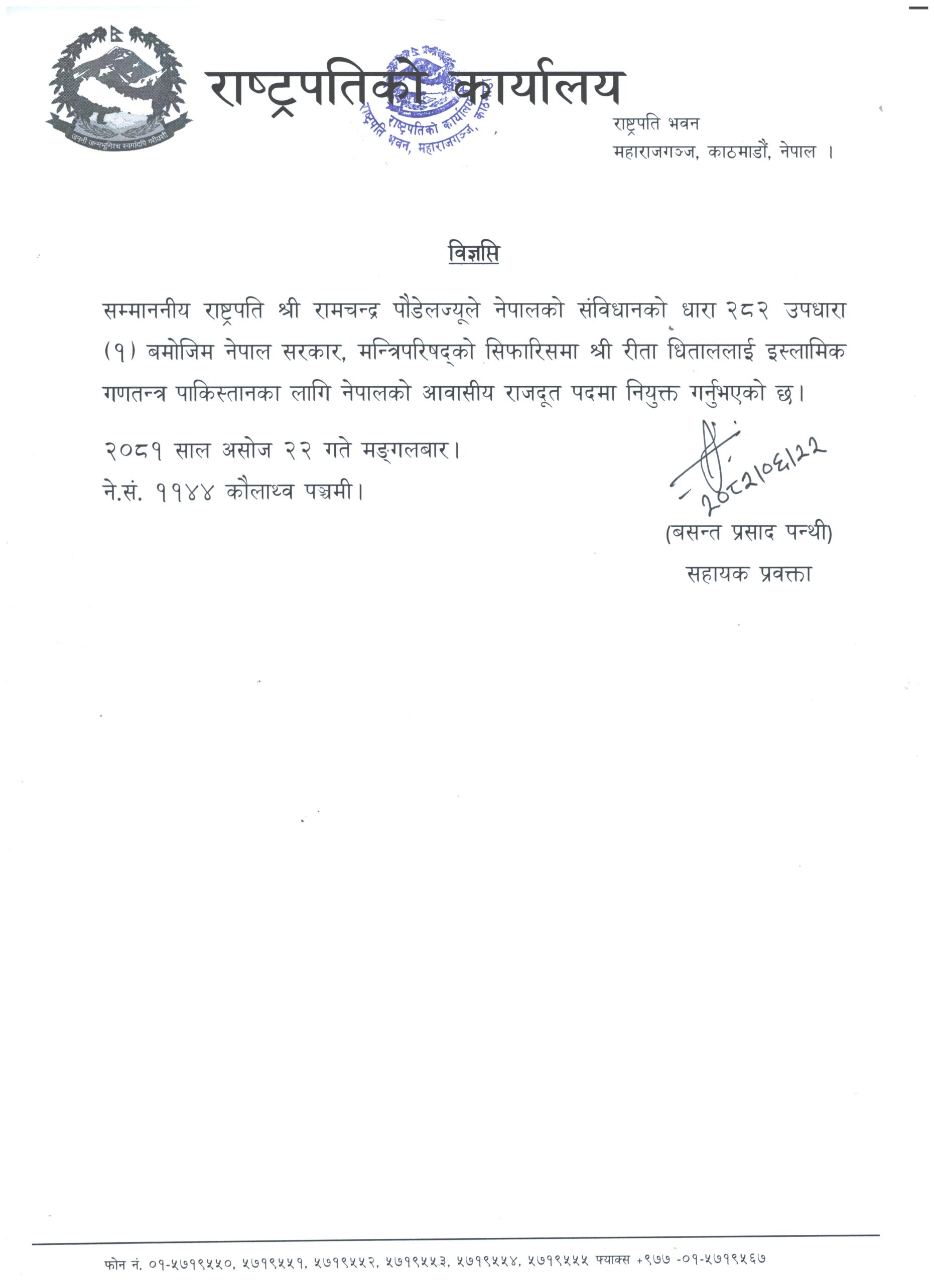 राष्ट्रपति कार्यालयका सहायक प्रवक्ता बसन्तप्रसाद पन्थीले प्रेस विज्ञप्ति जारी गर्दै धिताललाई नियुक्त गरिएको जानकारी दिए ।
