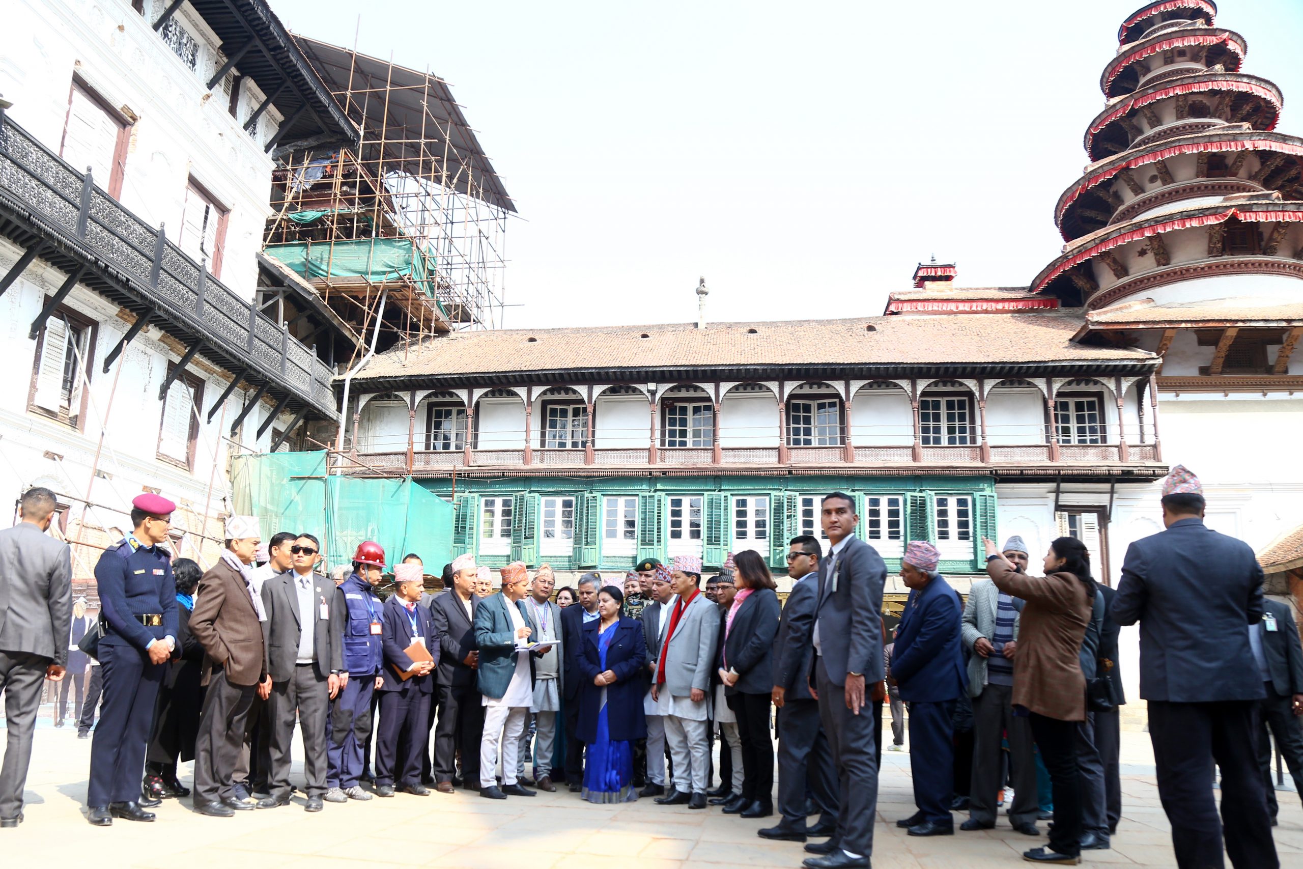 रानीपोखरीको निर्माणमा ६० प्रतिशत भएको छ भने दरबार हाइस्कुल निर्माण सम्पन्न भई हस्तान्तरणको चरणमा छ । धरहराको निर्माणको भौतिक प्रगति ३७ प्रतिशत रहेको छ भने काष्ठमण्डप र वसन्तपुर दरबारको उत्साहजनक ढङ्गबाट निर्माण भइरहेको छ । राष्ट्रपतिबाट भएको अवलोकन भ्रमणका क्रममा काठमाडौँ महानगरका प्रमुख र उपप्रमुख, संस्कृति, पर्यटन तथा नागरिक उड्डयन र शिक्षा मन्त्रालय तथा पूरातत्व विभागका उच्चपदस्थ अधिकृत सहभागी थिए । दरबार हाइस्कुल, काष्ठमण्डप र हनुमानढोका क्षेत्रमा राष्ट्रपतिबाट भएको अवलोकन भ्रमणमा नेपालका लागि चीनका राजदूत हाउ यान्छी सहभागी थिइन् ।