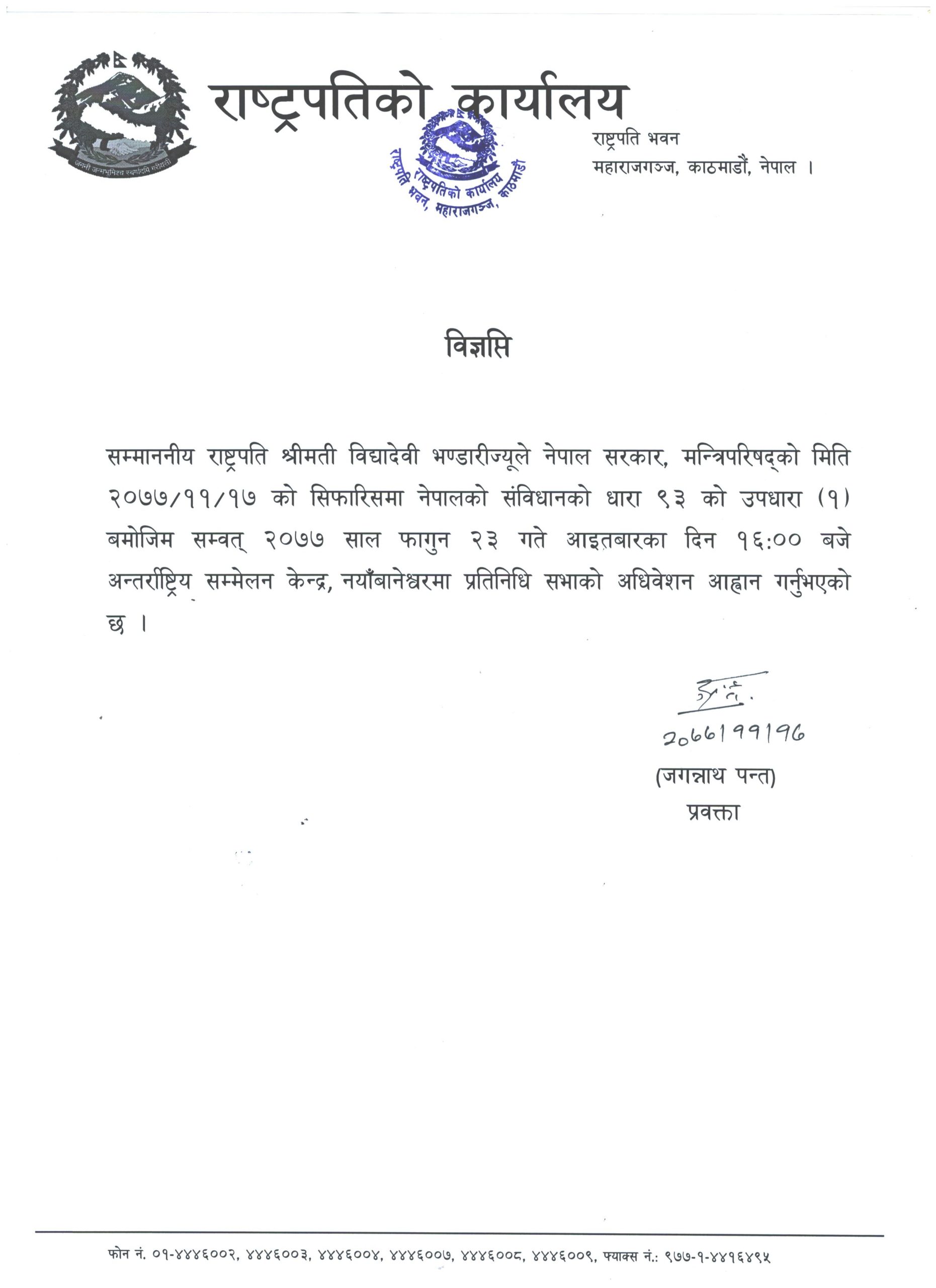 प्रवक्ता जगन्नाथ पन्तले प्रधानमन्त्री कार्यालयबाट प्राप्त संसद अधिवेशनको पत्र अनुसार राष्ट्रपतिले संसद अधिवेशन बोलाएको जानकारी दिए । राष्ट्रपतिले संविधानको धारा ९३ को उपधारा (१) बमोजिम संसद बैठक आह्वान गरेकी हुन् ।