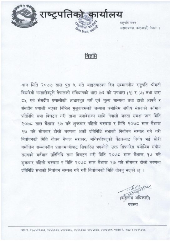 मन्त्रिपरिषद्को निर्णय बमोजिम प्रधानमन्त्री केपी शर्मा ओलीको सिफारिसमा राष्ट्रपतिले प्रतिनिधि सभा विघटन गरेको प्रवक्ता बद्रिनाथ अधिकारीले विज्ञप्तिमार्फत् जानकारी दिएका छन् ।