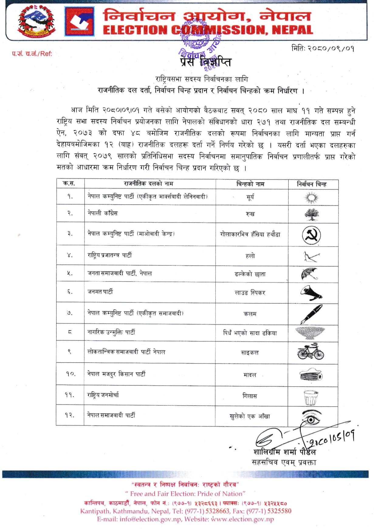 नेकपा एमाले, नेपाली कांग्रेस, नेकपा (माओवादी केन्द्र), राष्ट्रिय प्रजातन्त्र पार्टी, जनता समाजवादी पार्टी नेपाल, जनमत पार्टी, नेकपा (एकीकृत समाजवादी), नागरिक उन्मुक्ति पार्टी, लोकतान्त्रिक समाजवादी पार्टी नेपाल, नेपाल मजदुर किसान पार्टी, राष्ट्रिय जनमोर्चा र नेपाल समाजवादी पार्टीले चुनाव चिन्ह प्राप्त गरेका प्रवक्ता एवं सहसचिव शालिग्राम शर्मा पौडेलले जानकारी दिए।
