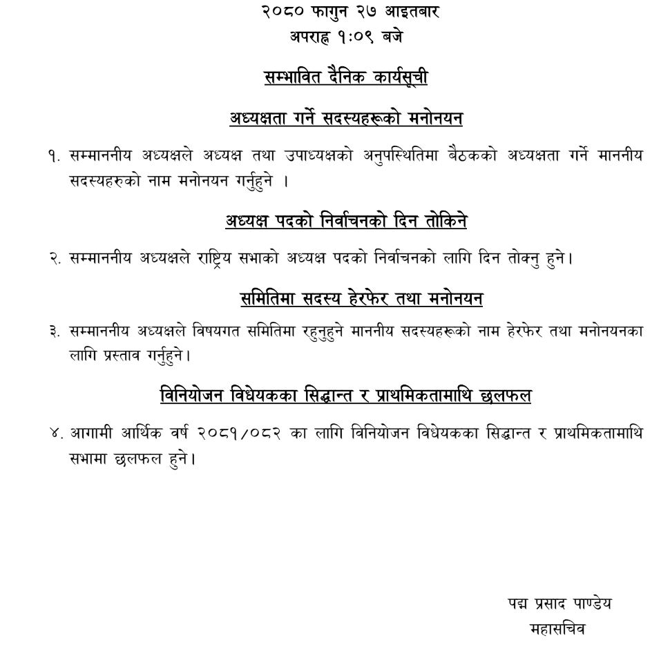 आजको बैठकमा अध्यक्ष तथा उपाध्यक्षको अनुपस्थितिमा बैठकको अध्यक्षता गर्ने सदस्यहरूको नाम मनोनयन गर्नेछन् । राष्ट्रियसभा अध्यक्ष पदको निर्वाचनको लागि दिन तोक्ने कार्यसूची रहेको छ ।