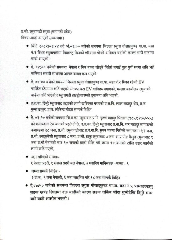 यस्तै जिल्ला प्रहरी कार्यालय रसुवाले मंगलबार बिहान भोटेकोसी नदीमा आएको बाढीपछि १८ जना सम्पर्कविहीन भएको जानकारी दिएको छ।