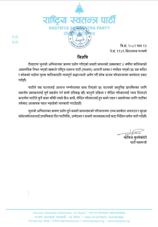 काठमाण्डु – रौतहटमा चुनावी अभियानका क्रममा प्रयोग गरिएको सवारी साधनको ठक्करबाट ४ वर्षीया बालिकाको मृत्युप्रति राष्ट्रिय स्वतन्त्र पार्टी (रास्वपा)ले दुःख प्रकट गरेको छ ।