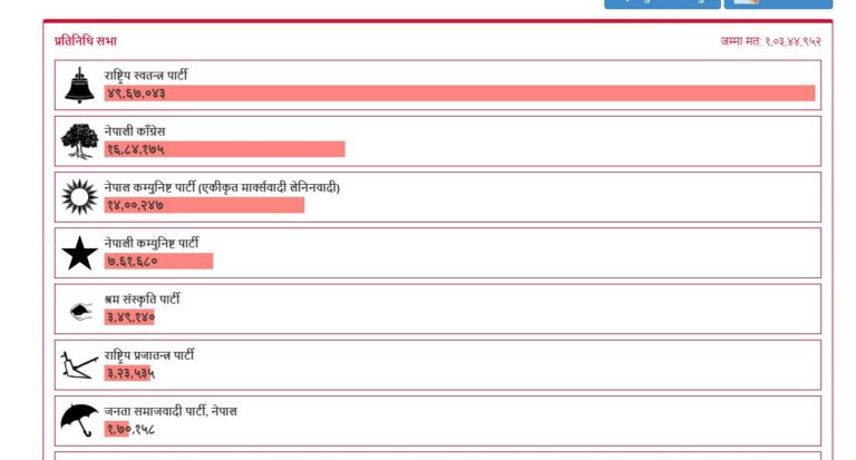 निर्वाचन आयोगले मंगलबार बिहान ८ बजे उपलब्ध गराएको विवरणअनुसार, कुल १ करोड ३ लाख ४४ हजार ९५२ मतगणना हुँदा रास्वपाले ४९ लाख ६७ हजार ०४३ मत प्राप्त गरेको हो ।