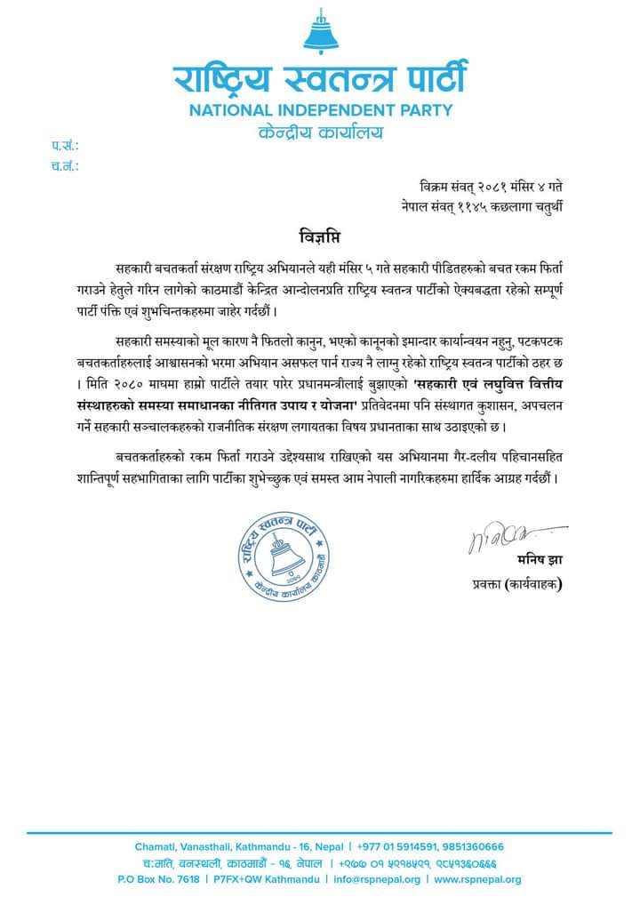‘सहकारी बचतकर्ता संरक्षण राष्ट्रिय अभियान’ सहित सहकारी पीडितहरुले बचत रकम फिर्ताको माग गर्दै काठमाडौं केन्द्रित आन्दोलन गर्ने तयारी गरिरहेको बेला रास्वपाले ऐक्यबद्धता जनाएको हो ।