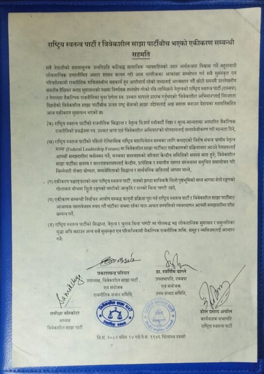 रास्वपाका तर्फबाट कार्यबाहक सभापति डोलप्रसाद अर्याल र डा.स्वर्णिम वाग्लेले हस्ताक्षर गरेका छन् भने विवेकशील साझाकी अध्यक्ष समीक्षा बाँस्कोटा र उपाध्यक्ष प्रकाशचन्द्र परियारबीच हस्ताक्षर भएको हो ।