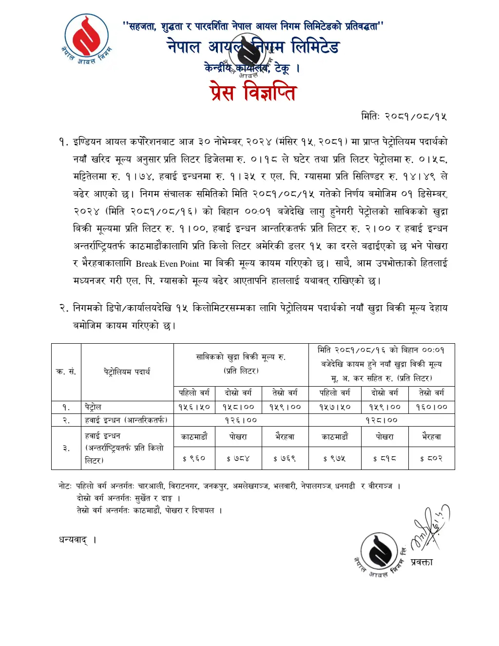 निगमले शनिबार राति १२ बजेदेखि लागू हुने गरी पेट्रोलमा १ रुपैयाँ, हवाई इन्धन (आन्तरिक) मा २ रुपैयाँ र हवाइ इन्धन (अन्तर्राष्ट्रिय) प्रतिकिलोलिटर काठमाण्डुमा १५, पोखरामा ३४ र भैरहवामा ३३ अमेरिकी डलरले वृद्धि गरेको छ ।
