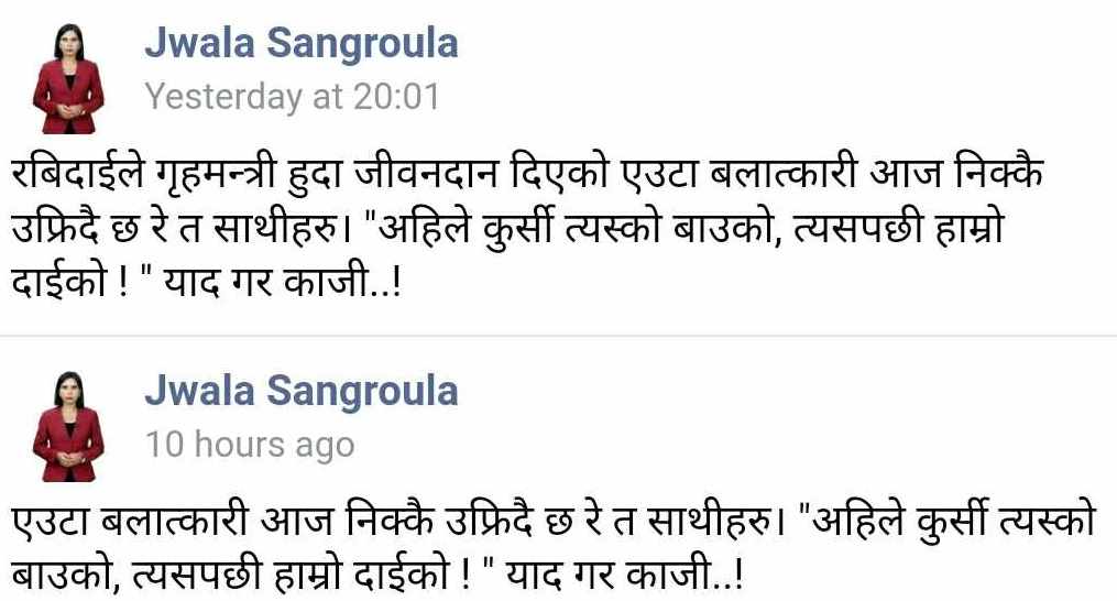 ‘रवि दाइले गृहमन्त्री हुँदा जीवनदान दिएको एउटा बलात्कारी आज निक्कै उफ्रिँदै छ रे त साथीहरू । अहिले कुर्सी त्यस्को बाउको, त्यसपछि हाम्रो दाइको। याद गर काजी’ फेसबुकमा केन्द्रीय सदस्य संग्रौलाले लेखेकी छिन् ।