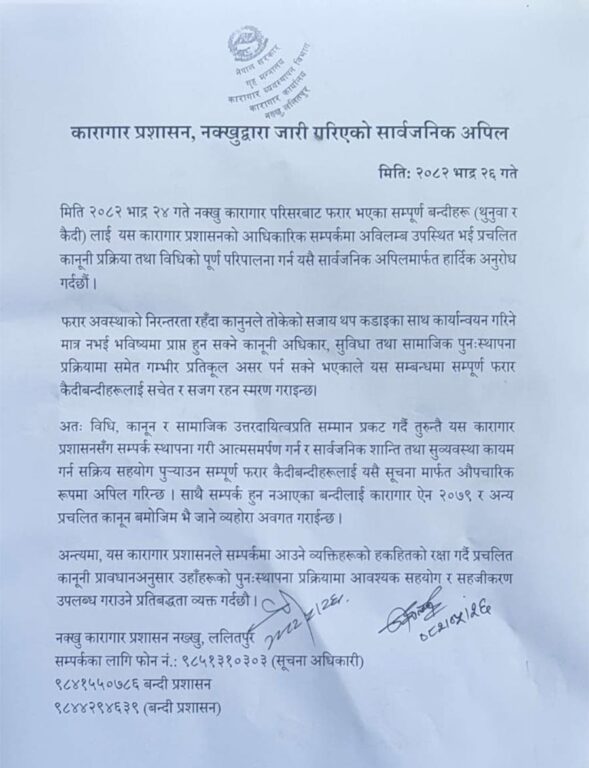 ‘भदौ २४ गते नक्खु कारागार परिसरबाट फरार भएका सम्पूर्ण बन्दीहरू (थुनुवा र कैदी)लाई यस कारागार प्रशासनको आधिकारिक सम्पर्कमा अविलम्ब उपस्थित भई प्रचलित कानुनी प्रक्रिया तथा विधिको पूर्ण परिपालना गर्न यसै सार्वजनिक अपिलमार्फत हार्दिक अनुरोध गर्दछौँ,’ कारागार प्रशासनद्वारा जारी विज्ञप्तिमा भनिएको छ।