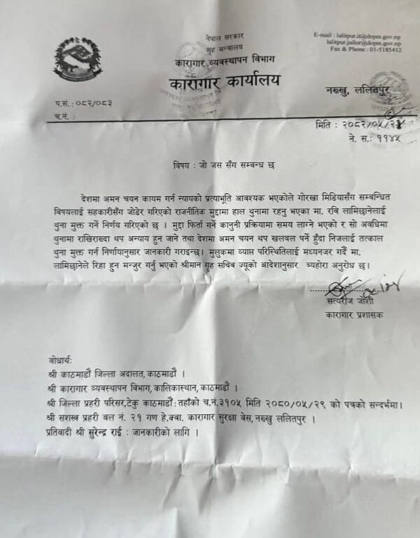 प्रमुख जोशीले भने, ‘हामीले उहाँलाई रिहा भएको कुनै पनि प्रकारको पत्र दिएका छैनौ ।’ उनले लामिछानेले सार्वजनिक गरेको पत्रको कुनै पनि अंश मिलेको नदेखिएको पनि बताए । उनले भने, ‘त्यो पत्र कहाँबाट कसरी ल्याउनुभएको मलाई थाहा भएन ।’ यता कारागार प्रशासनले लामिछानेलाई तत्काल सम्पर्कमा आउन पनि अनुरोध गरेको छ।