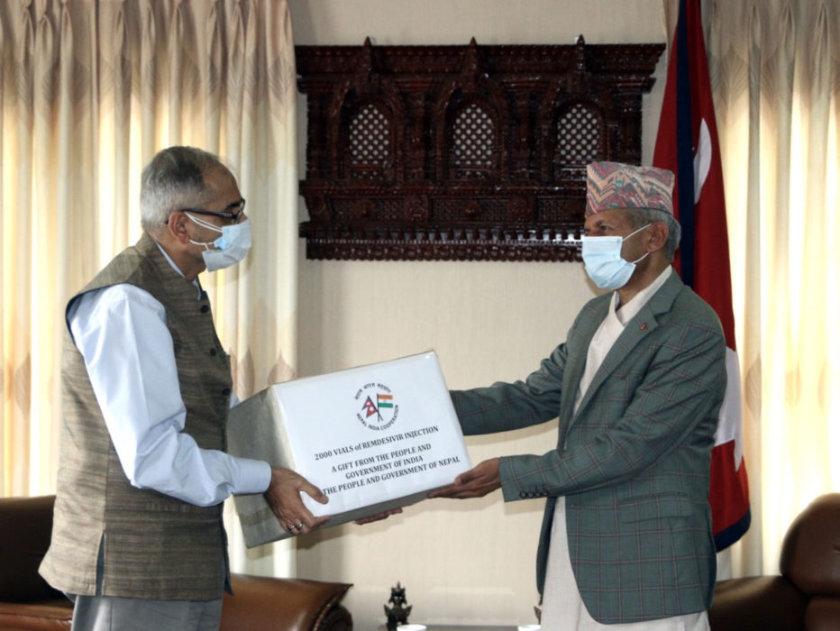 नेपालका लागि भारतका राजदूत विनयमोहन क्वात्राले भारत सरकारका तर्फबाट परराष्ट्रमन्त्री प्रदीपकुमार ज्ञवालीलाई दुई हजार थान रेमेडिसिभर उपहारस्वरुप हस्तान्तरण गरे ।