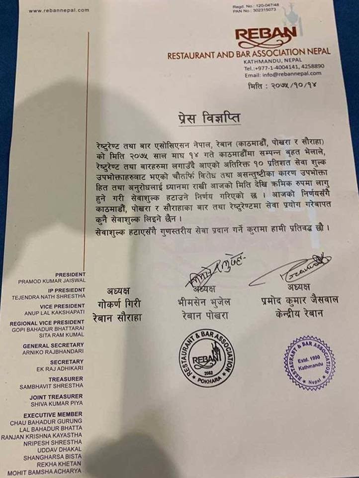 रेष्टुरेन्ट तथा बार एसोसियसन नेपाल (रेबान)को सोमबार काठमाडौंमा सम्पन्न भेलाले सेवा शुल्क हटाउने निर्णय गरेको हो। अबदेखि यस्तो शुल्क नलिने निर्णय गरिएको रेष्टुरेन्ट एन्ड बार एसोसिएसन नेपाल (रेबान)ले जनाएको छ।