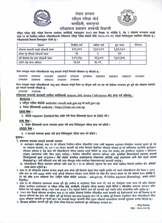 बोर्डको वेबसाइट result.neb.gov.np र नेपाल टेलिकमको वेबसाइट https://neb.ntc.net.np बाट नतिजा हेर्न सकिने बोर्डले जनाएको छ।