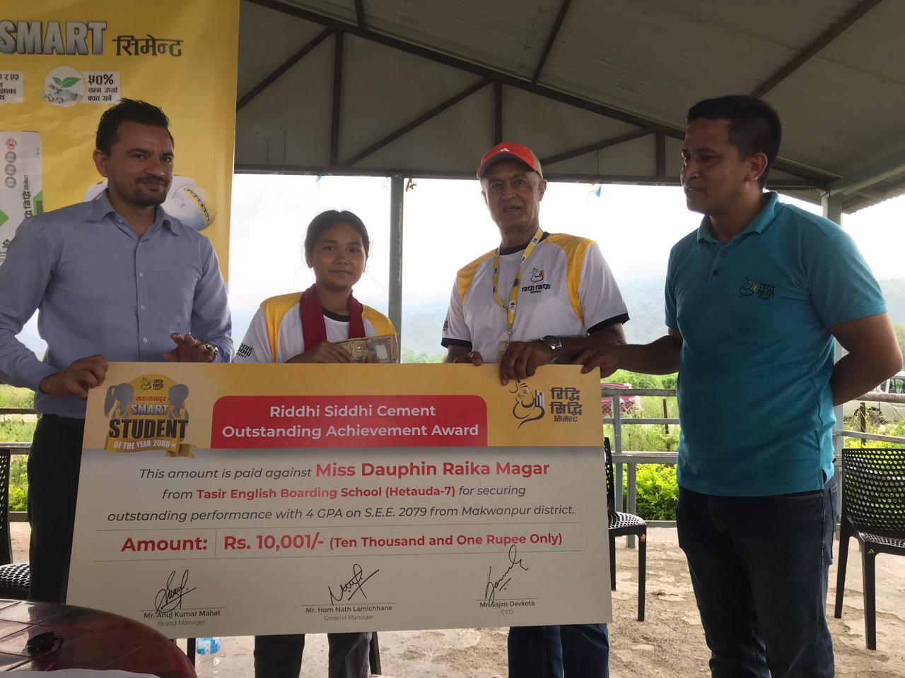 यस कार्यक्रममा मकवानपुर जिल्ला बाट एसईई परीक्षामा ४ जिपिए ल्याएकी डौफिन राइका मगरलाइ सम्मान स्वरूप नगद १०,००१ प्रदान गरिएको थियो ।
