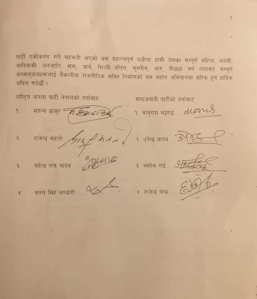 राजपा अध्यक्ष मण्डलका संयोजक शरदसिंह भण्डारीको निवासमा बुधवार मध्यरातमा दुवै पार्टीका शिर्ष नेताहरुबीच एकता गर्ने सहमती भएको हो ।