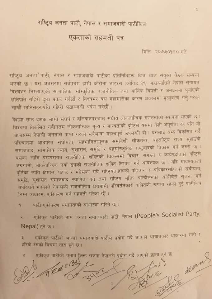 काठमाडौं – राष्ट्रीय जनता पार्टी नेपाल र समाजवादी पार्टी एकताको घोषणा भएको छ । प्रधानमन्त्री केपी शर्मा ओलीले दलविभाजनसम्बन्धी अध्यादेश ल्याएपछि दुवै दलहरुले एकताको लागी प्रक्रिया सुरु गरेका हुन् । दुवै दलले नयां पार्टीको नाम जनता समाजवादी पार्टी राखेका छन् । झण्डा भने समाजवादीको र चुनाव चिन्ह राजपाको राख्ने सहमती भएको छ ।