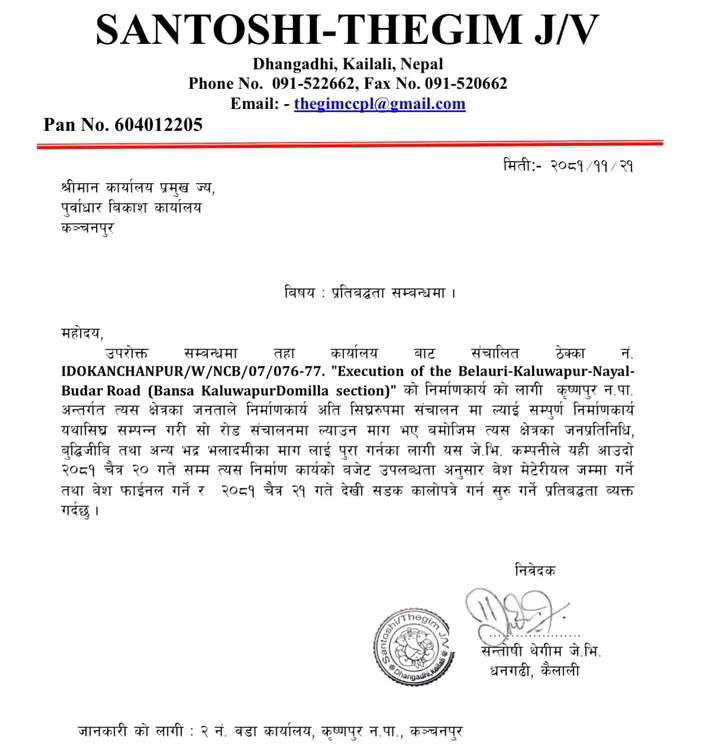 यससँगै वडाध्यक्ष साउँदले सन्तोषी थेगिम जेभीको प्रतिबद्धतापत्र पनि राखेका छन्, जसमा पूर्वाधार कार्यालय कञ्चनपुरलाई सम्बोधन गरिएको छ । प्रतिबद्धता पत्रमा लेखिएको छ, ‘कृष्णपुर नगरपालिका अन्तर्गत त्यस क्षेत्रका जनताले निर्माण कार्य अतिशीघ्र रूपमा सञ्चालनमा ल्याई सम्पूर्ण निर्माण कार्य यथाशीघ्र सम्पन्न गरी सो रोड सञ्चालनमा ल्याउन माग भए बमोजिम त्यस क्षेत्रका जनप्रतिनिधि, बुद्धिजीवी तथा अन्य भद्र भलादमीका मागलाई पूरा गर्नका लागि यस जेभी कम्पनीले यहीँ आउँदो २०८१ चैत २० गतेसम्म त्यस निर्माण कार्यको बजेट उपलब्धता अनुसार वेश मेटेरियल जम्मा गर्ने तथा वेश फाइनल गर्ने र २०८१ चैत २१ गतेदेखि सडक कालोपत्रे गर्न सुरु गर्ने प्रतिबद्धता व्यक्त गर्दछु ।’