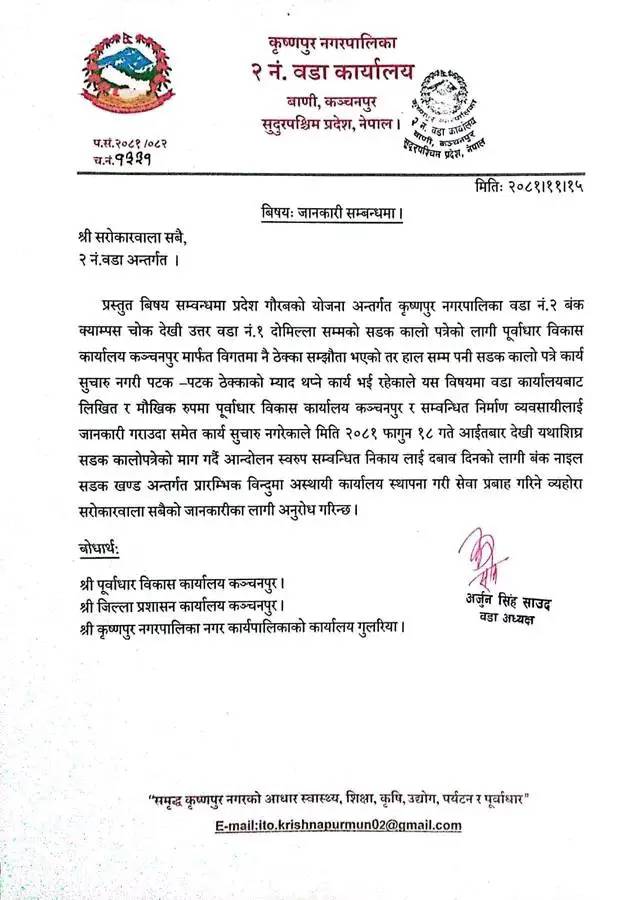 महेन्द्रनगर – कञ्चनपुरको कृष्णपुर नगरपालिका वडा नम्बर २ का वडाध्यक्ष अर्जुनसिंह साउँदले फागुन ११ गते एउटा सूचना प्रकाशित गरे, जसमा लेखिएको थियो – बंक–दोमिल्ला सडक कालोपत्रेका लागि दबाब दिन आन्दोलनस्वरूप फागुन १८ गते आईतबारदेखि बंक–नाइल सडकखण्ड अन्तर्गत प्रारम्भिक बिन्दुमा अस्थायी कार्यालय स्थापना गरी सेवा प्रवाह गरिने ।’