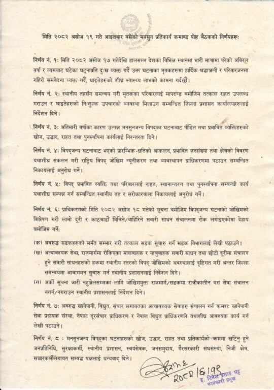 मनसुन प्रतिकार्य कमाण्ड पोष्टका संयोजक सचिव भीषण श्रेष्ठले हस्ताक्षर गरेको निर्णय पत्रमा राज्यका सबै निकाय, सुरक्षाकर्मी, स्वयंसेवक, जनप्रतिनिधि र गैरसरकारी संस्था उद्धार र राहतमा सक्रिय रहन आह्वान गरिएको छ ।
