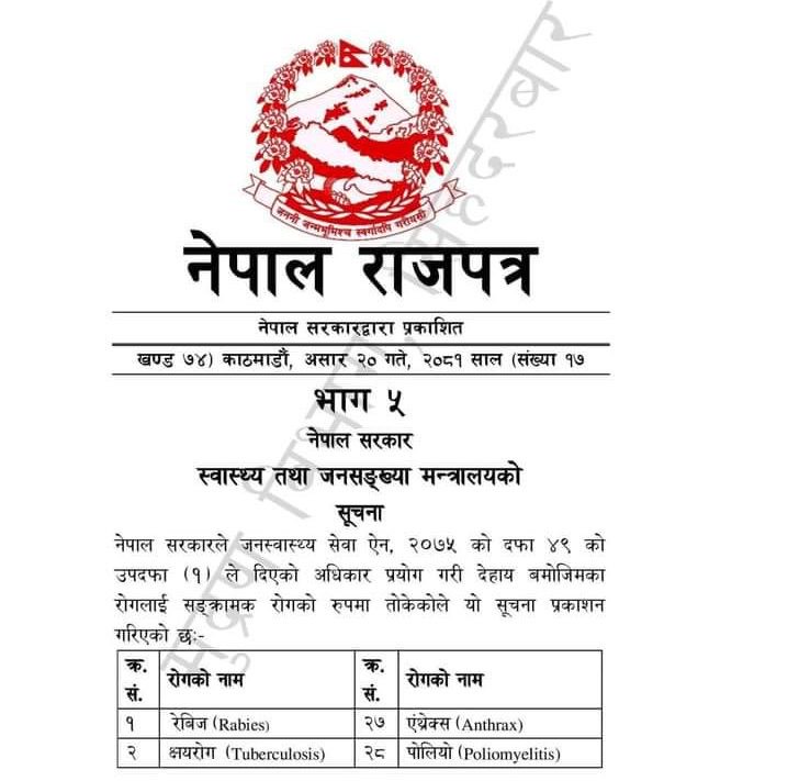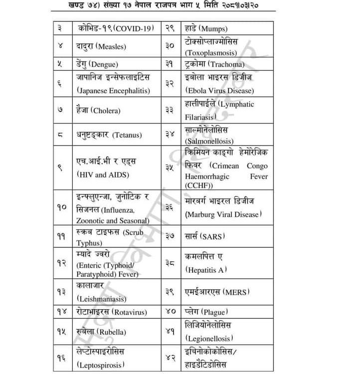 सरकारले राजपत्रमा जनस्वास्थ्य सेवा ऐन २०७५ को दफा ४९ को उपदफा १ ले दिएको अधिकार प्रयोग गरी पहिलो पटक ५२ वटा रोगलाई सङ्क्रामक रोगको सूची तयार पारेको हो ।