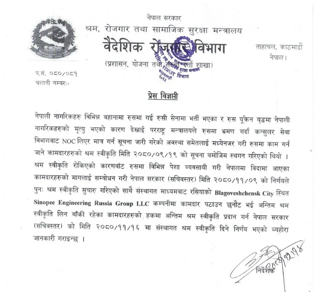 मेनपावर व्यवसायीबाट रूसको सिनोपेक इन्जिनीयरिङ रसिया ग्रूप (एलएलसी) कम्पनीमा कामदार पठाउन श्रम स्वीकृति दिने निर्णय गरिएको सूचनामा उल्लेख छ ।