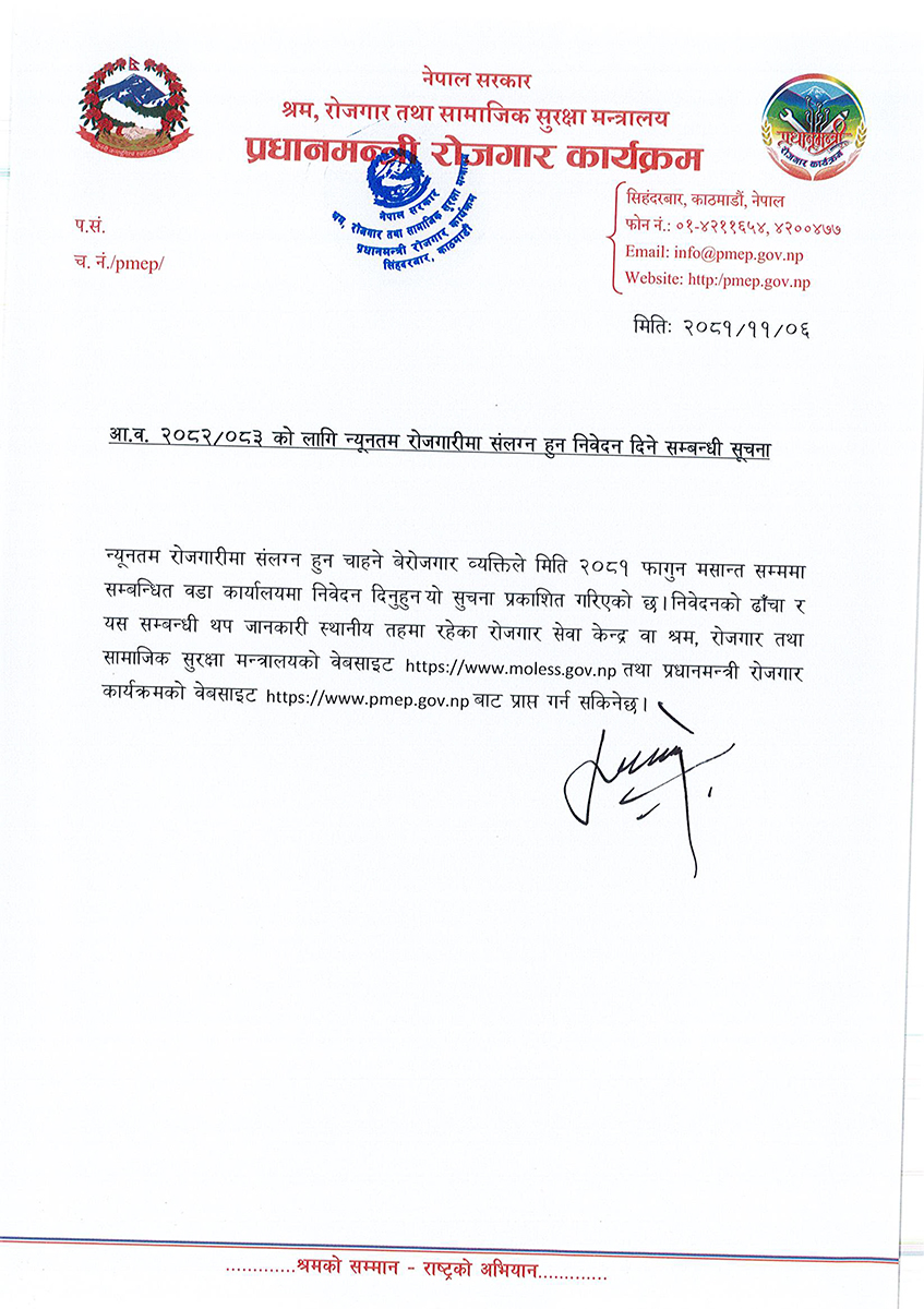 आगामी आर्थिक वर्ष २०८२/८३ का लागि प्रधानमन्त्री रोजगार कार्यक्रममार्फत न्यूनतम रोजगारीमा संलग्न हुन चाहने बेरोजगार व्यक्तिले फागुन मसान्तसम्म वडा कार्यालयमा निवेदन दिनसक्नेछन् ।
