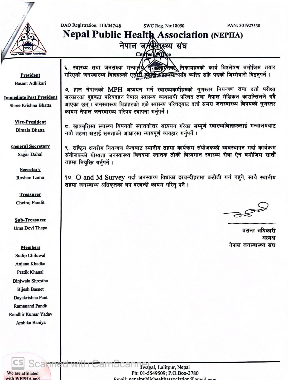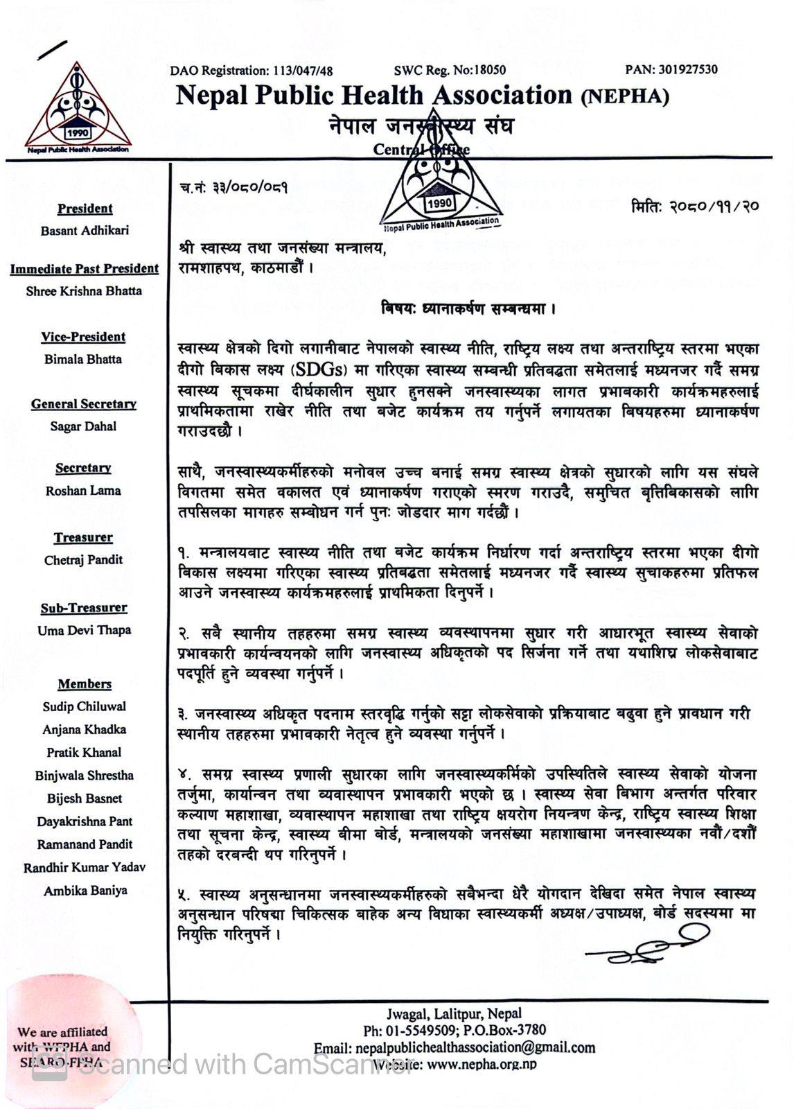 जसअनुसार जनस्वास्थ्य संघले मन्त्रालयबाट स्वास्थ्य नीति तथा बजेट कार्यक्रम निर्धारण गर्दा अन्तराष्ट्रिय स्तरमा भएका दिगो विकास लक्ष्यमा गरिएका स्वास्थ्य प्रतिवद्धता समेतलाई मध्यनजरमा गर्दै स्वास्थ्य सूचारकहरुमा प्रतिफल आउने जनस्वास्थ्य कार्यक्रमलाई दिनुपर्ने लगायतका माग गरेको छ ।