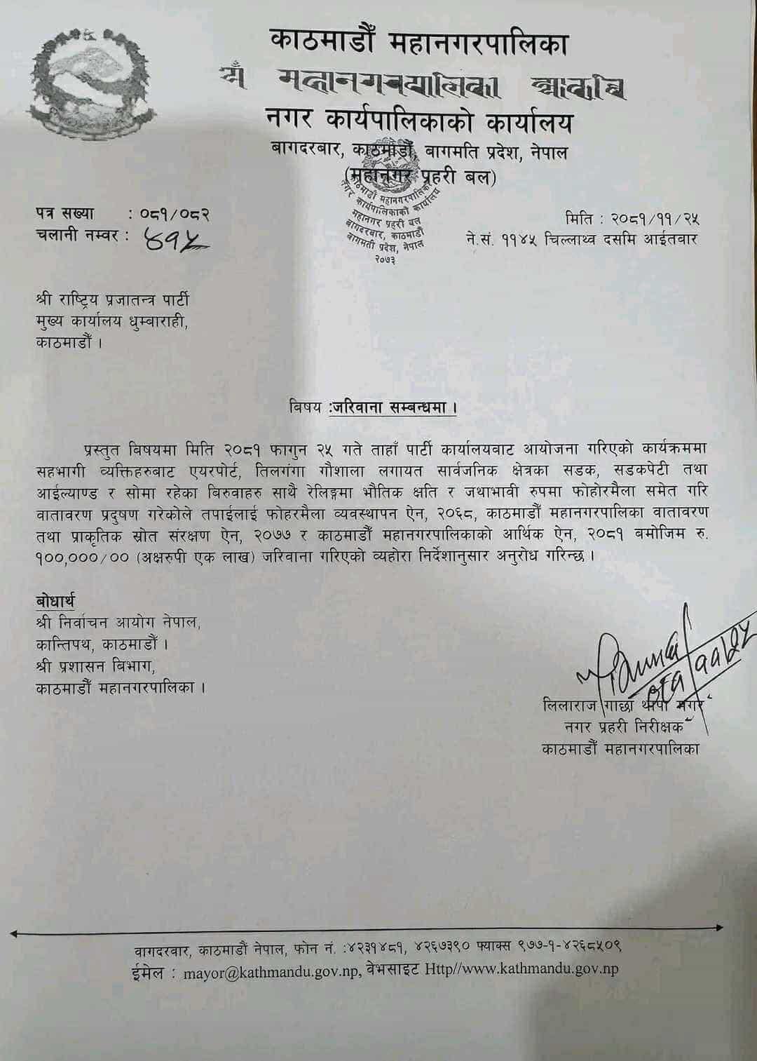 महानगरले राप्रपालाई पठाएको पत्रमा उल्लेख छ, ‘प्रस्तुत विषयमा मिति २०८१ फागुन २५ गते तहाँ पार्टी कार्यालयबाट आयोजना गरिएको कार्यक्रममा सहभागी व्यक्तिहरूबाट एयरपोर्ट, तिलगंगा, गौशाला लगायत सार्वजनिक क्षेत्रका सडक, सडक पेटी तथा आईल्याण्ड र सोमा रहेका बिरुवाहरू साथै रेलिङमा भौतिक क्षति र जथाभावी रूपमा फोहोरमैला समेत गरी वातावरण प्रदुषण गरेकोले तपाईंलाई फोहरमैला व्यवस्थापन ऐन २०६८, काठमाण्डु महानगरपालिका वातावरण तथा प्राकृतिक स्रोत संरक्षण ऐन २०७७ र काठमाण्डु महानगरपालिकाको आर्थिक ऐन २०८१ बमोजिम रु. १००,०००/०० (अक्षरुपी एक लाख) जरिवाना गरिएको व्यहोरा निर्देशानुसार अनुरोध गरिन्छ ।’