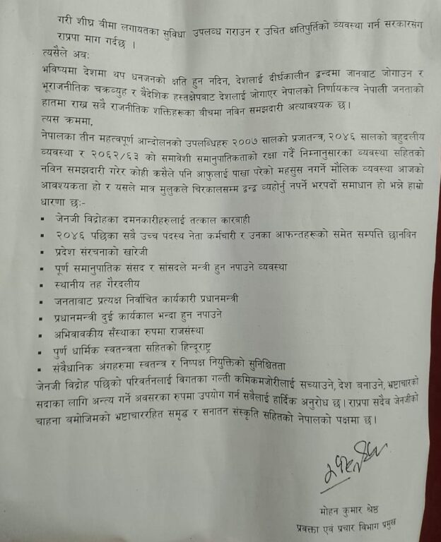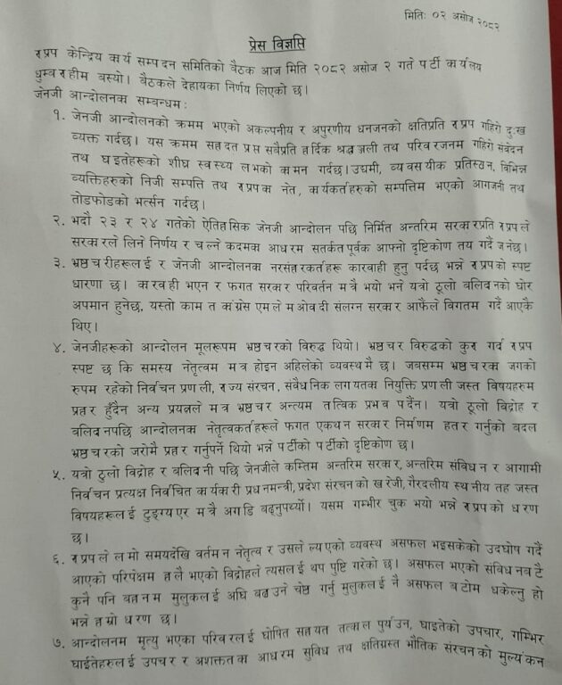 राप्रपाले हालको व्यवस्था नै परिवर्तन गर्नुपर्ने कुरालाई जोडका साथ उठाउँदै आन्दोलनका नरसंहारकर्ताहरूलाई कारवाहीको माग समेत गरेको छ ।