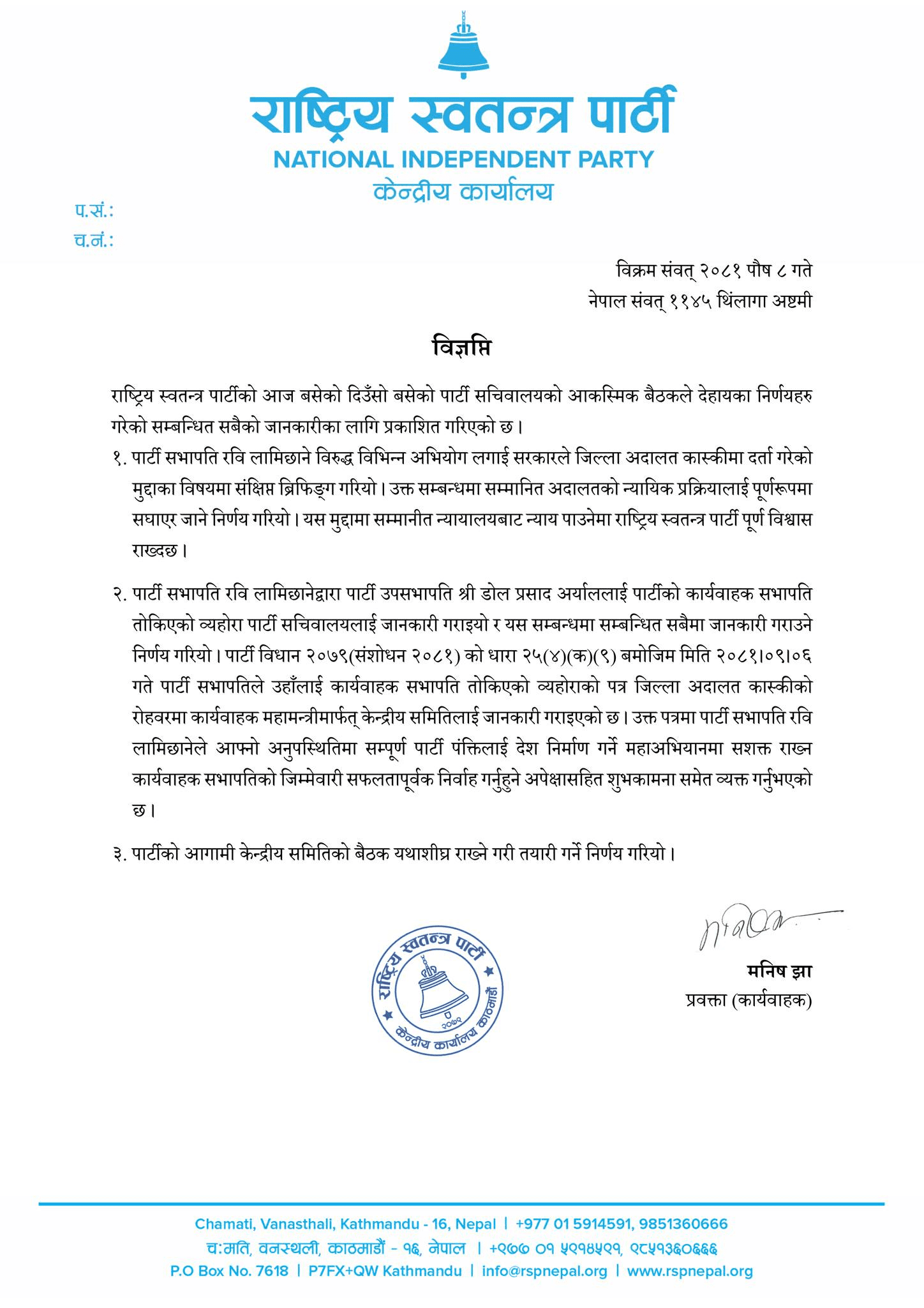 विज्ञप्तिमा उल्लेख छ, ‘पार्टी विधान २०७९ (संशोधन २०८१) को धारा २५ (४) (क) (९) बमोजिम पुस ६ गते पार्टी सभापतिले उनलाई कार्यबाहक सभापति तोकिएको व्यहोराको पत्र जिल्ला अदालत कास्कीको रोहवरमा कार्यबाहक महामन्त्रीमार्फत् केन्द्रीय समितिलाई जानकारी गराइएको छ । उक्त पत्रमा पार्टी सभापति रवि लामिछानेले आफ्नो अनुपस्थितिमा सम्पूर्ण पार्टी पंक्तिलाई देश निर्माण गर्ने महाअभियानमा सशक्त राख्न कार्यवाहक सभापतिको जिम्मेवारी सफलतापूर्वक निर्वाह गर्नुहुने अपेक्षासहित शुभकामना समेत व्यक्त गर्नुभएको छ ।’