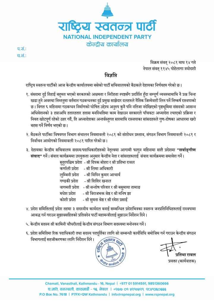 स्वतन्त्र जनप्रतिनिधिहरूलाई रास्वपामा आवद्ध गर्न सुझाव सहितको प्रतिवेदन पार्टी महामन्त्रीलाई बुझाउन प्रदेश समितिलाई निर्देशन दिने निर्णय बैठकले गरेको छ ।