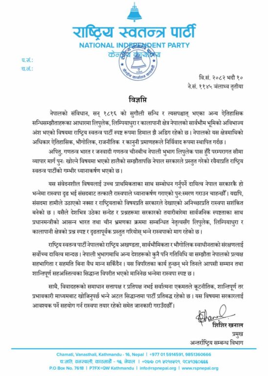 काठमाण्डु – राष्ट्रिय स्वतन्त्त पार्टी (रास्वपा)ले प्रधानमन्त्रीको आसन्न भारत तथा चीन भ्रमणका क्रममा सम्बन्धित नेतृत्वसँग लिपुलेक, लिम्पियाधुरा र कालापानी क्षेत्रको प्रश्न स्पष्ट र दृढतापूर्वक प्रस्तुत हुन माग राखेको छ ।