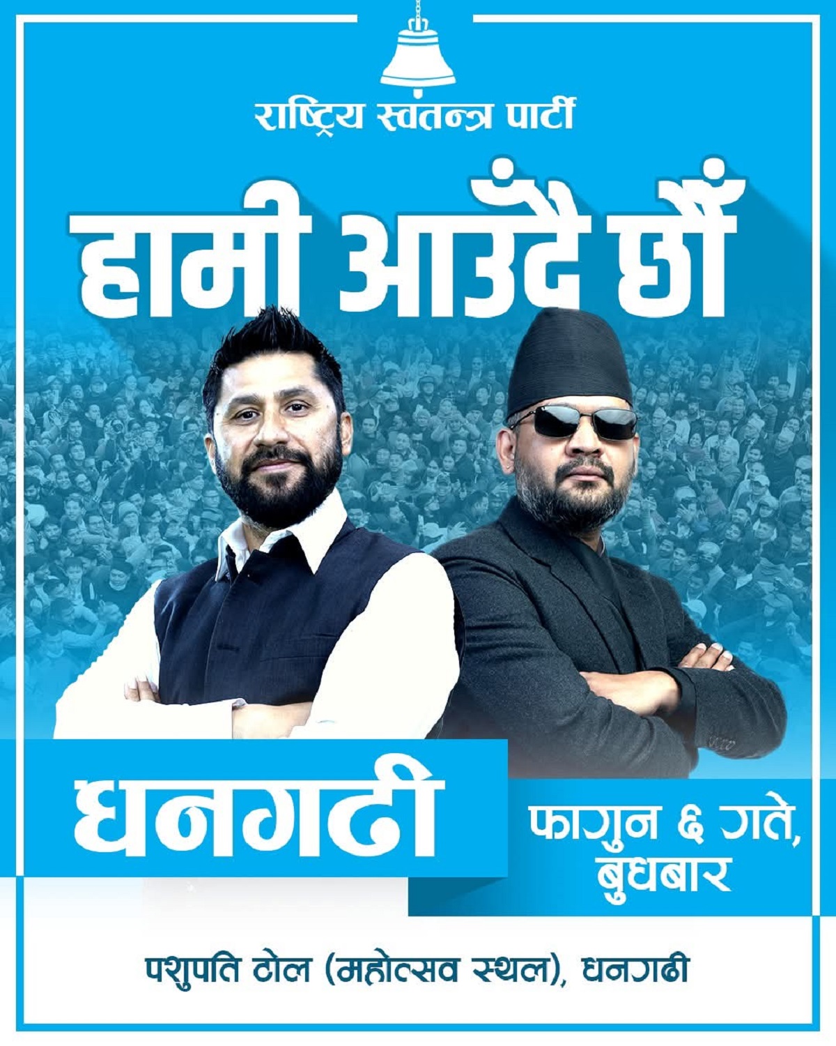 काठमाण्डु- राष्ट्रिय स्वतन्त्र पार्टी (रास्वपा)ले धनगढीमा बुधबार चुनावी सभा गर्दै छ । चुनावी सभालाई रास्वपा सभापति रवि लामिछाने र वरिष्ठ नेता बालेन्द्र शाह बालेनले सम्बोधन गर्ने कार्यक्रम छ ।