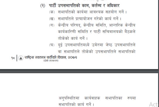 विधानको भाग ३(२) को पार्टी उपसभापतिको काम कर्तव्य र अधिकार शीर्षक अन्र्तगतको दफा (घ)मा दुई उपसभापतिमध्य उमेरमा ज्येष्ठ उपसभापतिले वा सभापतिले तोकेको उपसभापतिले सभापतिको अनुपस्थितिमा कार्यवाहक सभापतिका रूपमा सभापतिको कार्य गर्ने भन्ने लेखिएको छ ।
