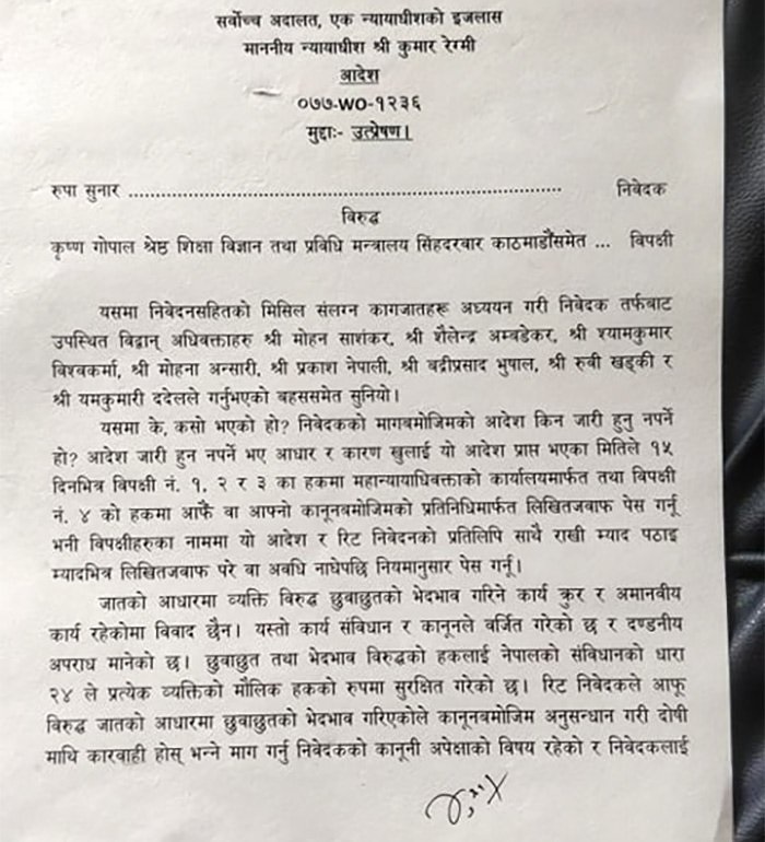 बबरमहलकी घरबेटी सरसवती महर्जनले जातीयताको कारण देखाउँदै आफूलाई कोठा भाडामा नदिएको भन्दै रुपाले सर्वोच्च अदालतमा रिट दायर गरेकी थिइन् ।