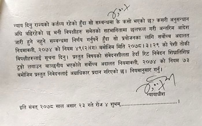 बुधबार न्यायाधीश नहकुल सुवेदीको एकल इजलासले मन्त्री श्रेष्ठ र सुनारलाई छलफलका लागि बोलाएको हो । अदालतले असार २९ गते उक्त घटनाको प्रमाणसहित अदालतमा उपस्थित हुन आदेश दिएको छ ।