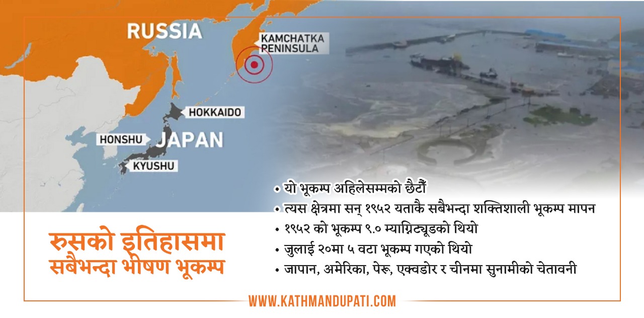 बुधबार बिहान को क्याम्च्याट्का प्रायःद्वीपमा ८.८ म्याग्निट्यूडको शक्तिशाली भूकम्प गएको हो । क्याम्च्याट्का क्षेत्रमा गएको भूकम्प २०११ मा जापानमा गएको विनाशकारी भूकम्पपछि विश्वमै अहिलेसम्म गएको सबैभन्दा शक्तिशाली भूकम्प हो ।