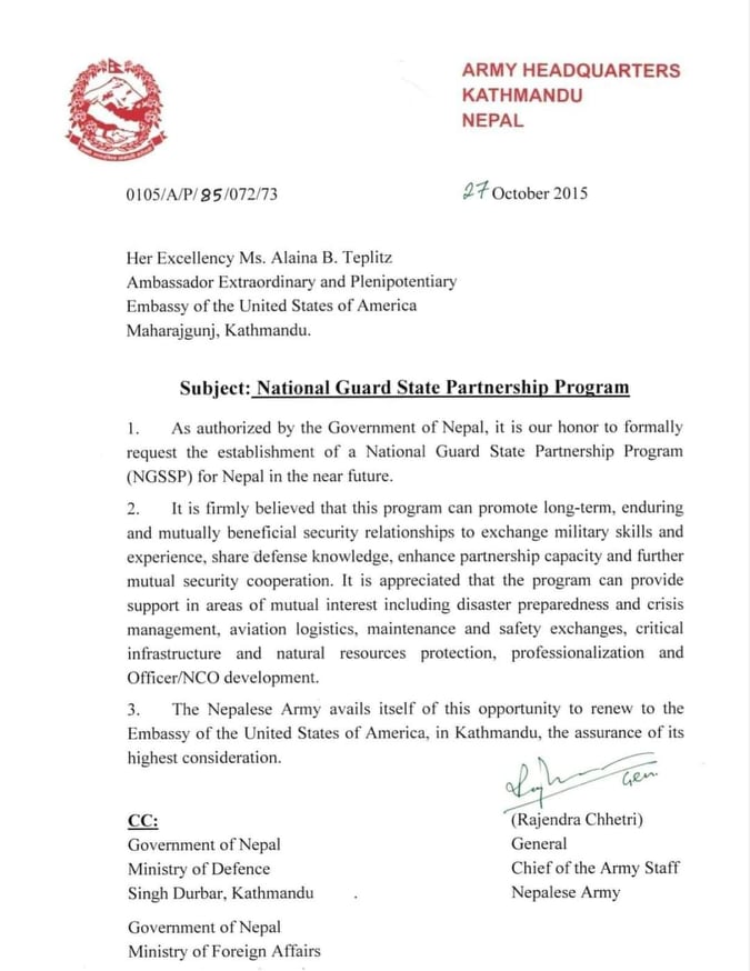 सन् २०१५ को अक्टोबर २७ मा (२०७२ कात्तिक १० गते) तत्कालीन प्रधान सेनापति राजेन्द्र क्षेत्रीले नेपाल सरकारका तर्फबाट एसपीपीमा संलग्न हुन नेपालस्थित अमेरिकी राजदूत अलाइना बी तेप्लिजलाई पत्र लेखेका थिए ।