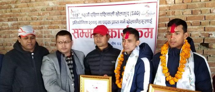 सङ्घले कैलालीको अत्तरियामा बुधबार आयोजित एक कार्यक्रमका बीच सुदूरपश्चिम प्रदेशको प्रतिनिधित्व गर्दै सागमा स्वर्ण पदक जित्ने कञ्चनपुरको कृष्णपुर नगरपालिका–९ का वीरबहादुर महरा र कास्य पदक जित्ने सोही वडाका मनोज मल्ललाई सम्मान गरेको हो ।