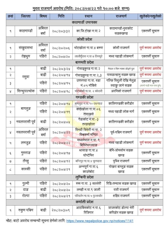 यस्तै तनहुँको बन्दिपुर ४ चुनपहडास्थित पृथ्वी राजमार्ग, कास्कीको अन्नपूर्ण गाउँपालिका ६ स्थित पोखरा बागलुङ सडक, गुल्मीको रुरु ३ स्थित रिडी तम्घास सडक, दाङको लमही नगरपालिका ९ स्थित राप्ती राजमार्ग र रोल्पाको परिवर्तन गाउँपालिकास्थित सहिद राजमार्गमा आज एकतर्फी रुपमा आलोपालो गरेर सवारी सञ्चालन भइरहेको पनि प्रहरीले जनाएको छ।