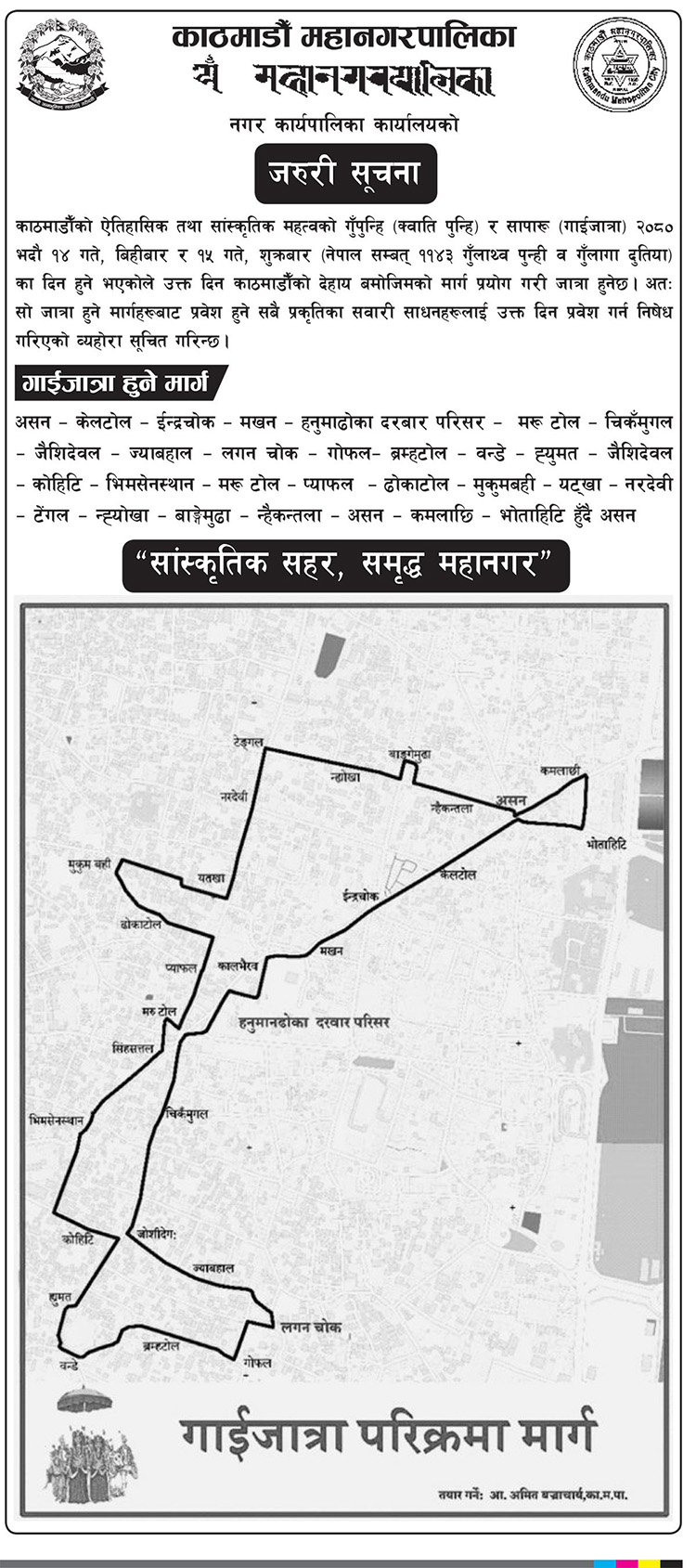 बिहीबार (आज) गाईजात्रा र शुक्रबार (भोलि) गुँलागा दुतिया मनाउने भएकाले काठमाडौं महानगरपालिकाले यी दुई दिन काठमाडौंका विभिन्न क्षेत्रमा सवारी आवगमन निषेध गरेको हो ।