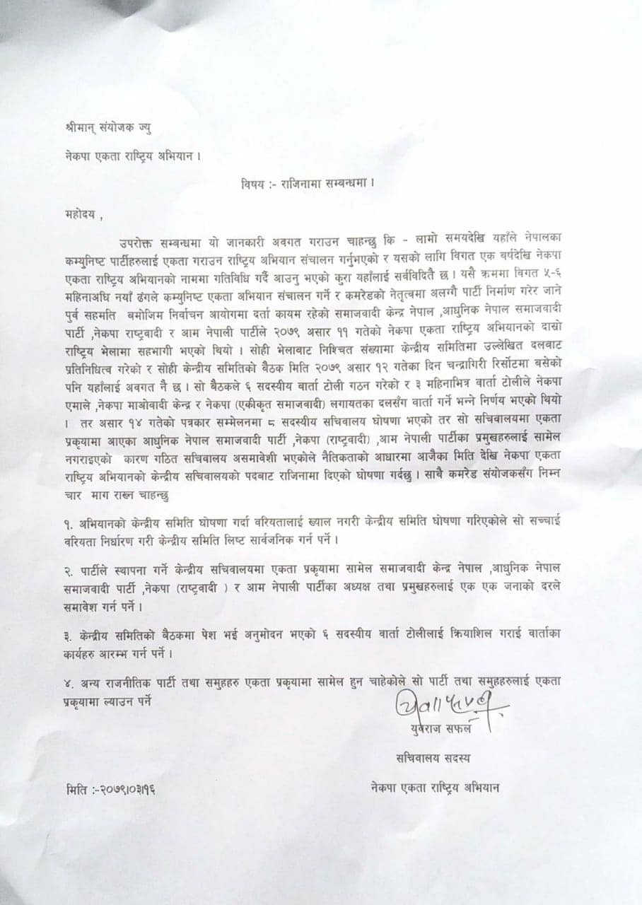‘अभियानका नौ जना सचिवालय सदस्यहरूमध्ये युवराज सफलले ०७९ असार १६ गते सचिवालय सदस्यबाट राजीनामा गर्नुभएको र १७ असारमा संयोजक कमरेड वामदेव गौतमको अध्यक्षतामा बसेको सचिवालय बैठकमा छलफल भई राजीनामा स्वीकृत गर्ने निर्णय गरिएको छ,’ पाण्डेले भने ।