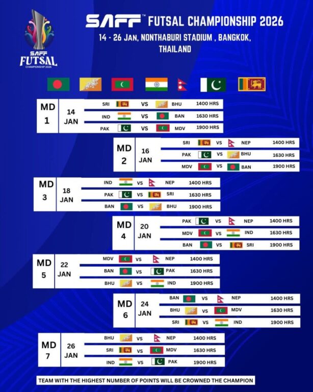 काठमाण्डु – दक्षिण एसियाली महासंघ (साफ)ले साफ फुटसल च्याम्पियनसिपको खेल तालिका सार्वजनिक गरेको छ।