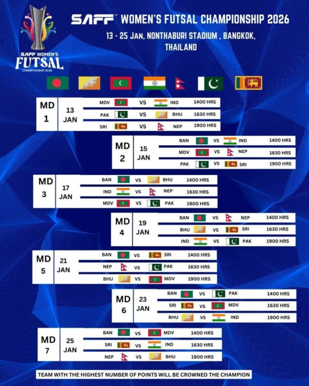 साफले शुक्रबार खेल तालिका सार्वजनिक गरेको हो। थाइल्यान्डको राजधानी बैंककमा हुने सो च्याम्पियनसिप आगामी जनवरी १३ देखि २६ गतेसम्म आयोजना हुनेछ।