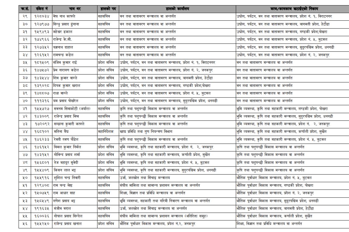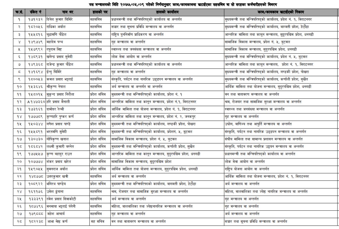 काठमाण्डु – सङ्घीय मामिला तथा सामान्य प्रशासन मन्त्रालयले सहसचिवहरुको सरुवा गरेको छ । बुधबार मन्त्रालयले ६० जना सहसचिव वा सो सरहका कर्मचारीहरुको काज सरुवा गरेको हो ।
