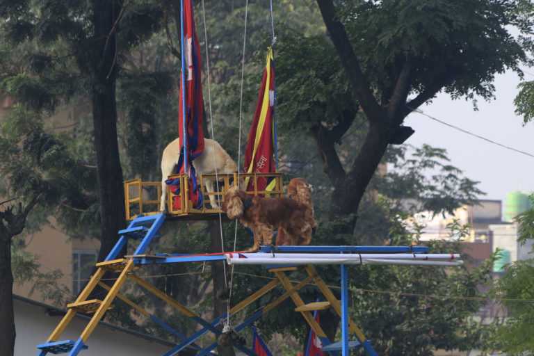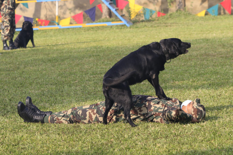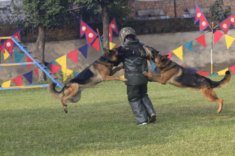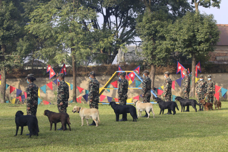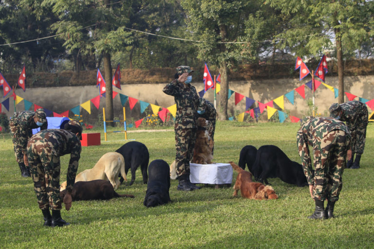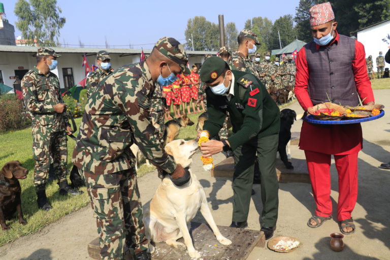 काठमाण्डु – नेपाली सेनाले कुकुर तिहारको अवसरमा सैनिक डग तथा कला प्रदर्शनी गरेको छ । बुधबार बिहानै नेपाली सेनाले मध्यपुर थिमि–२ सानो थिमिस्थित भैरव बहान गुल्ममा सैनिक डग कला प्रदर्शनी तथा कुकुर पुजा कार्यक्रम राखेको हो ।