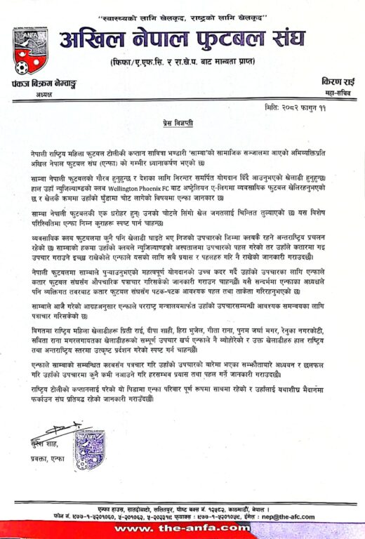 काठमाण्डु– राष्ट्रिय महिला फुटबल टोलीकी कप्तान सावित्रा भण्डारी ‘साम्बा’को अभिव्यक्तिप्रति अखिल नेपाल फुटबल संघ (एन्फा)ले गम्भीर ध्यानाकर्षण भएको बताएको छ।