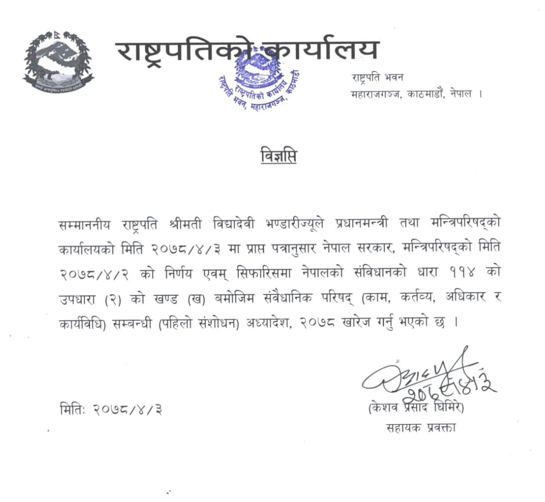 प्रधानमन्त्री शेरबहादुर देउवा नेतृत्वको शनिबार मन्त्रिपरिषद्को बसेको बैठकको सिफारिसअनुसार राष्ट्रपति विद्यादेवी भण्डारीले अध्यादेश खारेज गरेकी हुन् ।